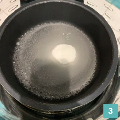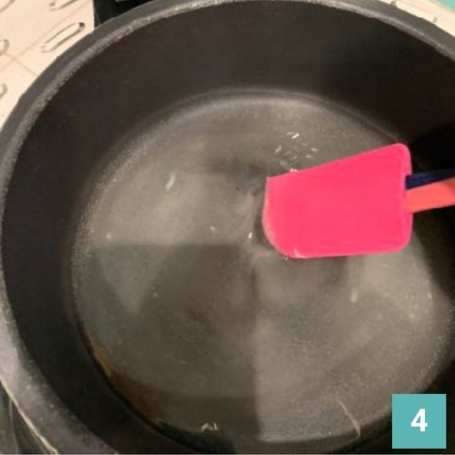 Conclusa la fase di preriscaldamento, versare nel tegame l’acqua calda e lo zucchero[3]. È importante che acqua e zucchero abbiano rispettivamente lo stesso peso delle arance, in questo caso 250 grammi. Mescolare bene[4] e impostare la temperatura di Grand Chef a 260°C con fan alta sino a quando lo sciroppo non avrà raggiunto il bollore[5]