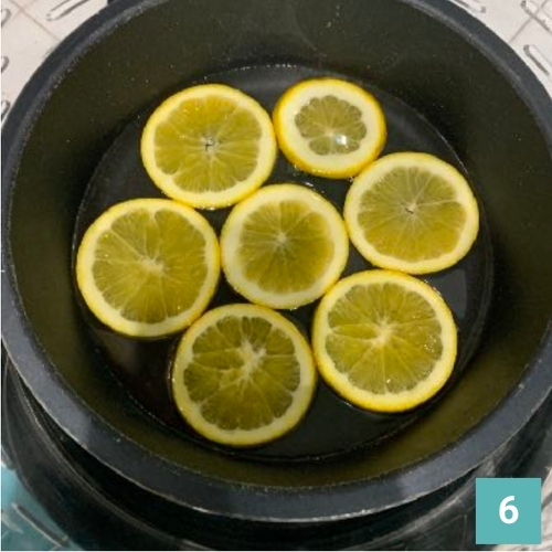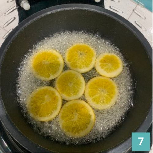 A questo punto aggiungere al tegame le fette di arancia, facendo in modo di ricoprirle con lo sciroppo e continuare[6] a far cuocere per 20 minuti a 260°C, fan media. Giunte a metà cottura girare le fette e proseguire sino a quando lo sciroppo non si restringerà e inizierà a creare una leggera schiuma[7]. A partire da questo momento, lasciar cuocere per altri 5 minuti.
