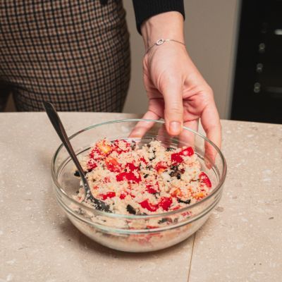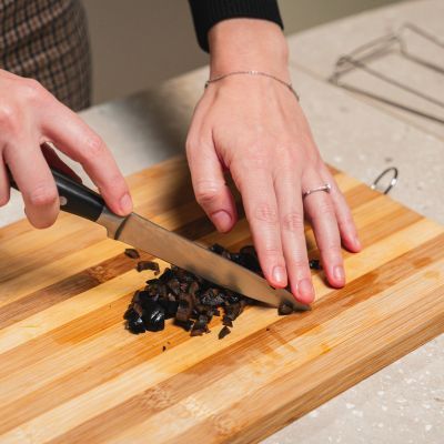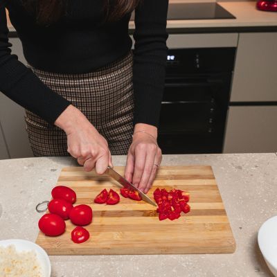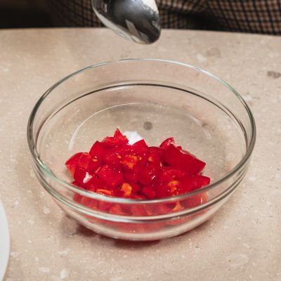 Tagliare i pomodorini a brunoise, a piccoli cubetti[9], e farli scolare. Sminuzzare le olive denocciolate.[10]