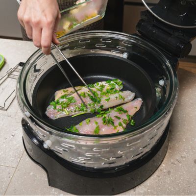 Trascorso il tempo della marinatura[18], adagiare i filetti di spigola sul tegame caldo[19] e ricoprirli con la gratinatura aiutandosi con un cucchiaio.[20] Bagnare il tutto impiegando una parte dell’emulsione usata per la marinatura.[21] Impostare dal display la cottura a 205°C, fan alta, per 7 minuti.[22]