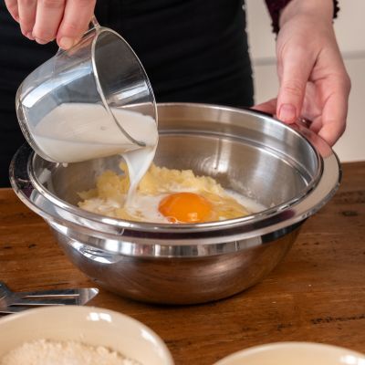 Una volta cotte le patate, sbucciarle, posizionarle in una ciotola[3] e schiacciarle con una forchetta[4].