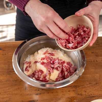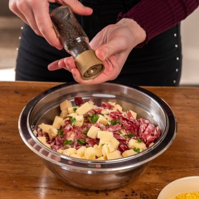 Unire via via l’uovo[5], il latte[6], il burro[7], il parmigiano grattugiato[8], le fettine di salame tagliate a pezzetti[9], i formaggi a tocchetti[10], del prezzemolo tritato[11] e un pizzico di pepe[12], mescolando e continuando a lavorare il composto con le mani[13].