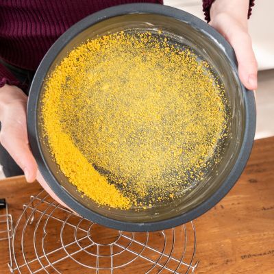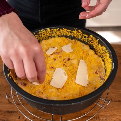 Nel frattempo imburrare il fondo e le pareti di un tegame di 22 cm di diametro[16] e versarvi all’interno del pane grattugiato, facendo in modo che aderisca su tutta la superficie interna[17]. Versare nel tegame l’impasto di patate[18] livellandolo con una spatola. Coprire con un leggero strato di pane grattugiato[19] e aggiungere alcuni ciuffetti di burro[20].