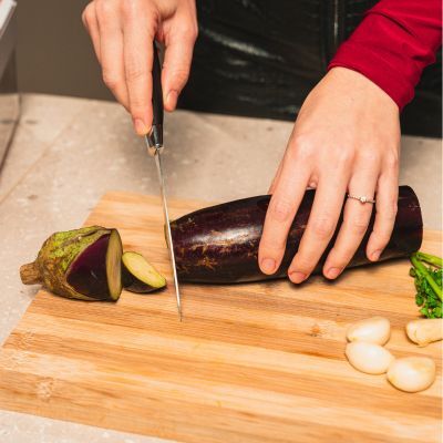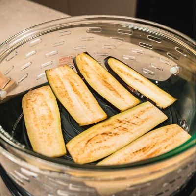 Una volta concluso il preriscaldamento, ungere leggermente la teglia piena con olio[5], utilizzando della carta assorbente[6], disporre le fette di melanzane[7] e far cuocere a 260°C, fan alta, per 8 minuti[8]. Quando le melanzane saranno pronte, disporle in un contenitore sottovuoto a chiusura ermetica della linea EvoFresh con all’interno olio EVO, aglio e prezzemolo[9; 10].