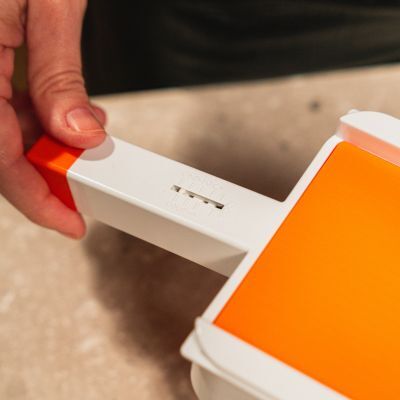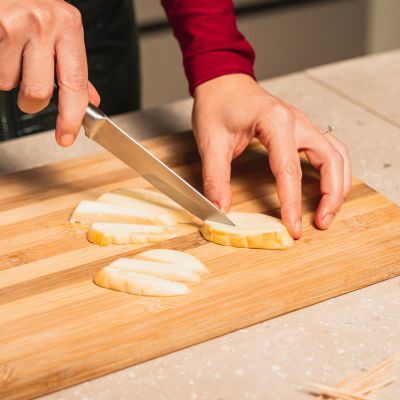 Per preparare gli involtini, come prima cosa lavare e asciugare con cura le melanzane, privarle del peduncolo e della base[1], quindi tagliarle a fette spesse 5 mm[2] con l’aiuto della mandolina EvoSlice[3].