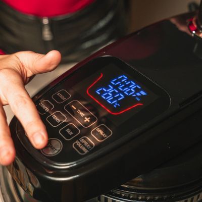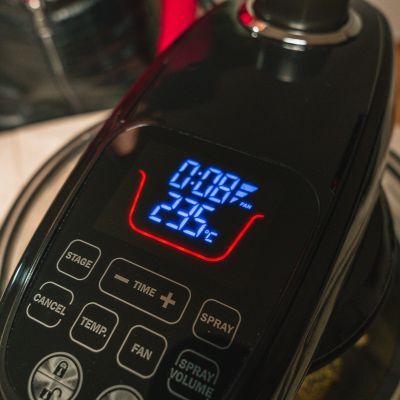 Preriscaldare Grand Chef Evolution a 260°C, fan alta, per 6 minuti[4] con all’interno la teglia piena, lato grill, posta sulla griglia media.
