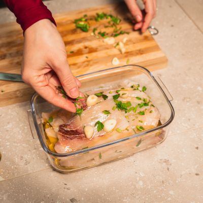 Tagliare le fette di pesce spada a metà, quindi privarle della pelle e della spina centrale[11]. Tagliare a pezzettini l'aglio[12] e tritare il prezzemolo[13], poi adagiare le fette in un contenitore e lasciarle marinare con olio, aglio e prezzemolo[14; 15] per almeno 30 minuti all’interno del frigorifero. Se sono molto spesse è consigliabile batterle con l’ausilio del fondo di un bicchiere: è necessario infatti che le fette siano sottili per facilitare la realizzazione degli involtini e garantire una cottura uniforme e veloce.