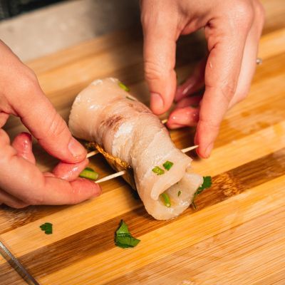 Trascorso il tempo dedicato alla marinatura, si possono preparare gli involtini. Stendere su un piatto o un tagliere una fettina di pesce spada[17], adagiarvi sopra una fettina di melanzana[18], poi una listarella di scamorza affumicata[19] e avvolgere il tutto creando un involtino[20], da sigillare con uno stuzzicadenti.[21]
