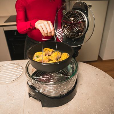Il pesce spada si presta perfettamente alla preparazione di involtini in virtù delle sue carni compatte, che si possono arrotolare facilmente senza sfaldarsi e rimangono sode anche dopo la cottura. Le fettine sottili, prive di lische, consentono di realizzare involtini regolari e facili da sigillare, capaci di trattenere al meglio il ripieno e cuocere in modo uniforme. Inoltre, il gusto equilibrato, leggermente dolce ma delicato, si sposa alla perfezione con farciture vegetali e formaggi, oltre che con la classica mollica aromatizzata come vuole la tradizione culinaria siciliana. Preparare gli involtini di pesce spada con Grand Chef Evolution ci offre numerosi vantaggi: grazie alla cottura con circolazione forzata dell’aria calda, il pesce rimane morbido e succoso mentre il pangrattato in superficie diventa dorato e piacevolmente croccante impiegando pochissimo olio. Le melanzane possono essere grigliate direttamente nel dispositivo, riducendo passaggi e tempi di preparazione, facendoci risparmiare tempo e fatica senza sporcare troppe stoviglie. In pochi minuti si otterranno dei rotolini dorati e leggeri, che mantengono una consistenza tenera e un cuore filante. Vediamo come si realizzano gli involtini di pesce spada con Grand Chef Evolution.