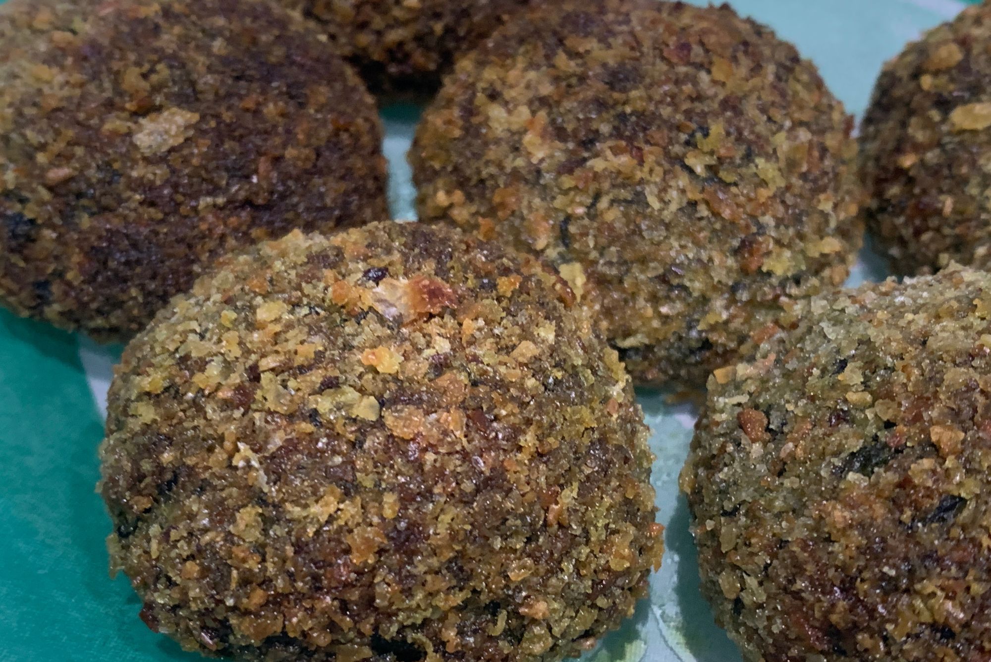 Passare le polpette di spinaci e ricotta nel pangrattato e poi cospargerle d’olio con l’aiuto di uno spruzzino oppure spennellarle.
