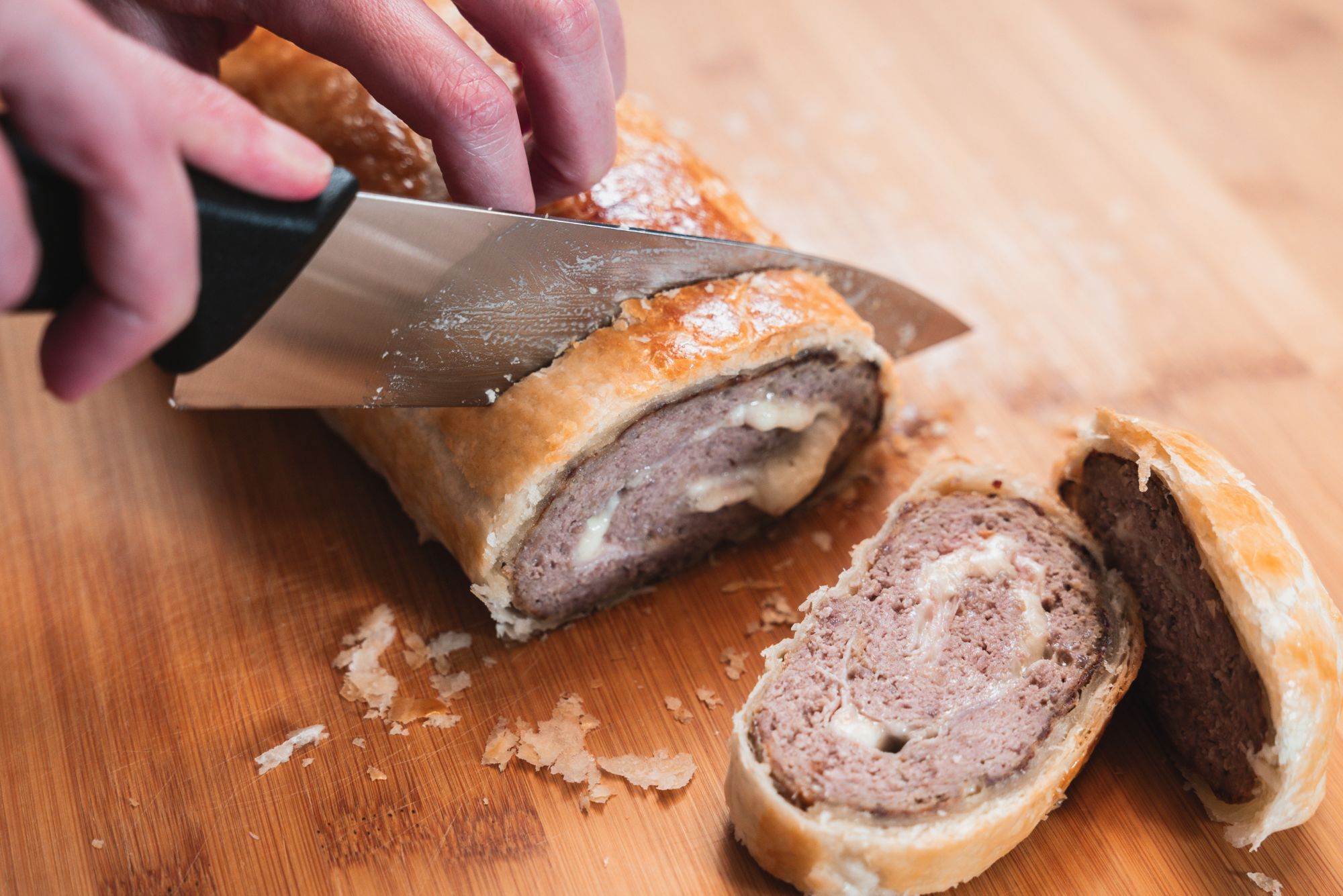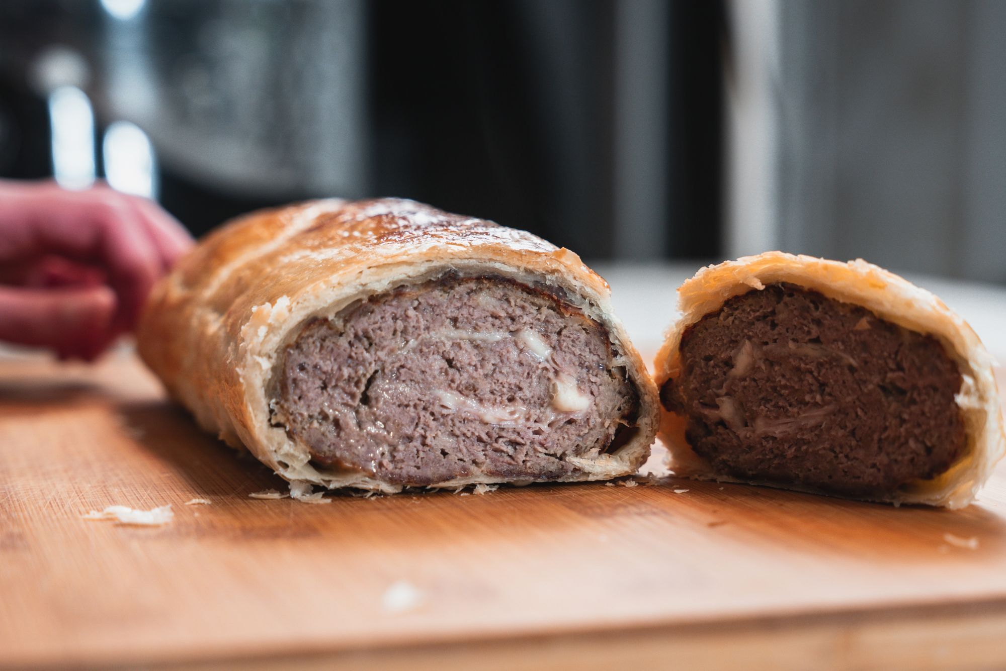 Stendere il rotolo di pasta sfoglia e spennellarlo con l’uovo sbattuto, posarvi sopra il polpettone e avvolgerlo, avendo cura di sigillare bene entrambe le estremità. Concludere spennellando con l’uovo sbattuto la pasta sfoglia farcita per ottenere una doratura finale perfetta.