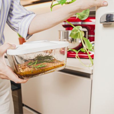 LEGGI DI PIÙSciacquare e tamponare i filetti di salmone[1], adagiarli in un contenitore dove verrà effettuata la marinatura e versare l’olio Evo[2]. Aggiungere quindi pepe nero macinato fresco[3], sale[4], aceto balsamico[5], rametti di rosmarino[6], e riporre il contenitore ermetico tappato, possibilmente in sottovuoto[7], in frigorifero per circa mezz’ora[8].