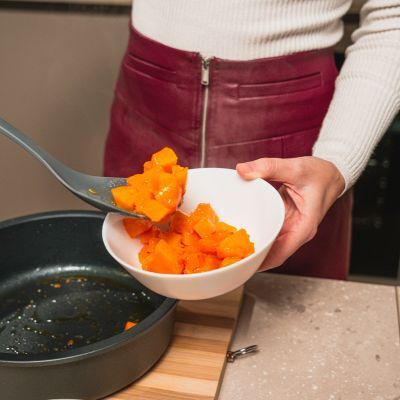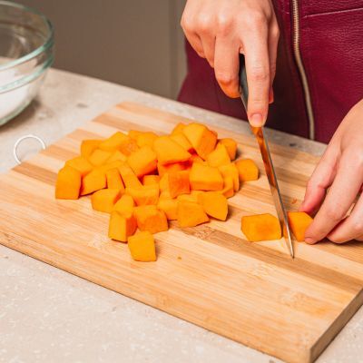 Per preparare questa ricetta si parte dalla pulizia della zucca: dopo averla lavata e asciugata, aprirla in due, rimuovere i semi interni, privarla della buccia con un coltellino e tagliarla a cubetti.[1]