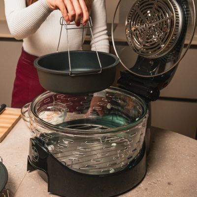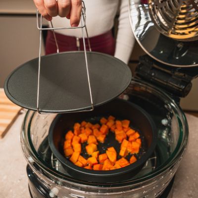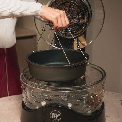 Estrarre il tegame da Grand Chef Evolution con l’aiuto della pinza multiuso[28], attendere qualche minuto affinché la torta di zucca si raffreddi[29], dopodiché toglierla dallo stampo. Servirla su un elegante piatto di portata con una spolverata di zucchero a velo.[30]