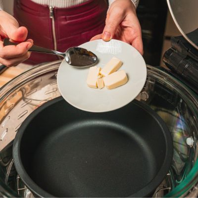 Posizionare il tegame Ø 22 cm della linea Professional sulla griglia bassa di Grand Chef Evolution[2] e aggiungere una noce di burro[3]. Far preriscaldare a 260°C, fan alta, per 5 minuti[4].