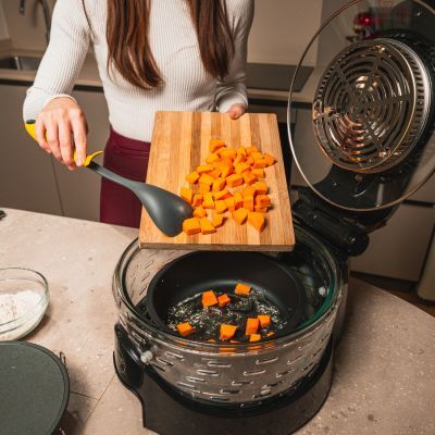 Terminato il preriscaldamento, mettere nel tegame la zucca tagliata a dadini[5], mescolare con cura[6] e far soffriggere per 5 minuti con fan alta a 260°C.[7]
