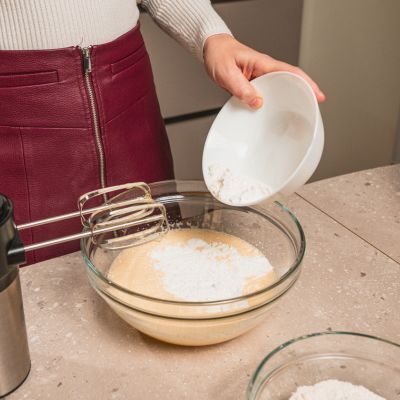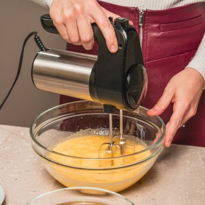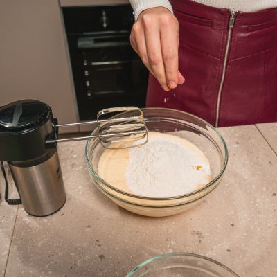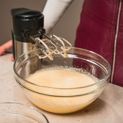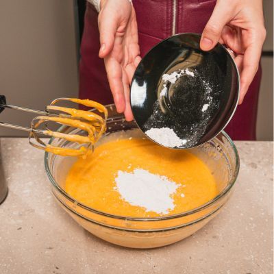 A questo punto aumentare la velocità delle fruste elettriche e versare l’olio di semi a filo.[20] Una volta che sarà ben incorporato, integrare anche la bustina di lievito in polvere[21] e proseguire la lavorazione per amalgamare al meglio gli ingredienti, eliminando gli eventuali grumi.[22]