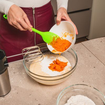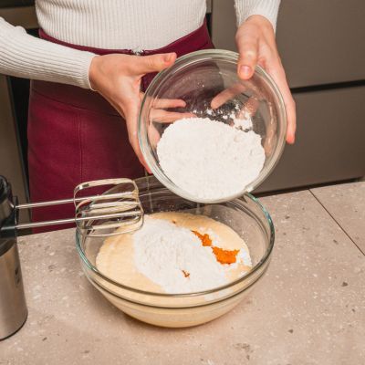 A parte, in un’ampia terrina o nella ciotola della planetaria, unire le uova allo zucchero[12] e iniziare a lavorare con le fruste elettriche a velocità media.[13] Quando le uova avranno incorporato lo zucchero e il composto sarà diventato chiaro e senza grumi[14], aggiungere mano a mano l’amido di mais[15], la zucca cotta[16], la farina[17] e un pizzico di sale[18] e continuare a lavorare il tutto con le fruste a media velocità[19] sino a quando il composto non diventerà liscio e omogeneo.